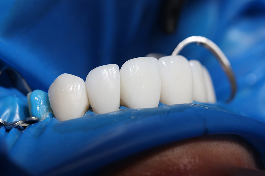 Lékař detailně vyšetří poškozený zub včetně jeho kořenového systému a určí jeho prognózu. Po zkontrolování celého chrupu stanoví vhodný postup ošetření. V zubní ordinaci spolu s pacientem vybere barvu keramiky podle okolních zubů nebo jeho přání. V místním znecitlivění zbrousí zub do požadovaného tvaru a provede otisky nebo skenování obou čelistí. Vždy na místě zhotovíme provizorní korunku, aby pacient neodcházel s obroušeným zubem.